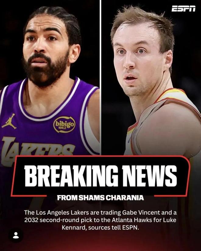 據Shams報道,湖人將蓋布-文森特和一個2032年的次輪簽送到老鷹,得到盧克-肯納德。