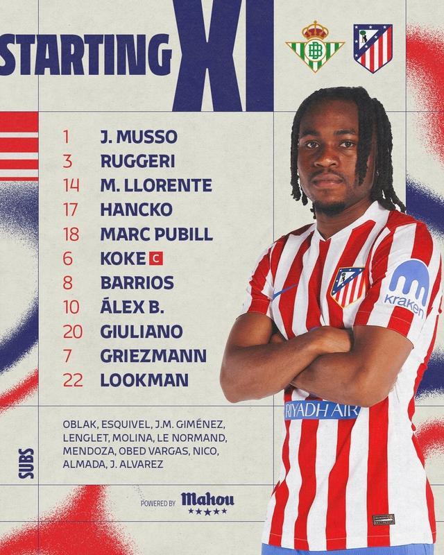 馬競首發:1-穆索、14-馬科斯-略倫特、18-普維爾、17-漢茨科、3-魯傑裏、20-小西蒙尼、8-巴裏奧斯、6-科克、10-巴埃納、7-格列茲曼、22-盧克曼