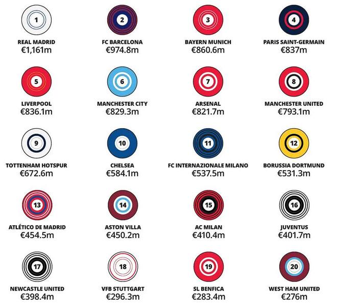 1、皇家馬德裏(Real Madrid) 西班牙 11.61億歐元/+11%