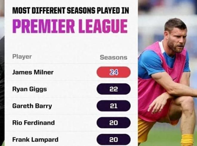 米爾納早已超越吉格斯、巴裏和費迪南德等名宿,成為英超曆史上出場賽季最多的球員-9。當這兩項紀錄集於一身時,這位曾在曼城和利物浦獲得英超冠軍、在利物浦贏得歐冠獎杯的傳奇球員,將被永遠鐫刻在英超豐碑上。